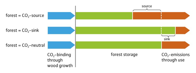 As long as the forest’s carbon stock does not shrink, timber extraction and with it the use of wood for energy is climate-neutral (bottom bar in Figure 5), so the atmosphere is not burdened with additional CO2 through the burning of wood. If the amount of timber extracted is lower than the wood growth increment, the forest even acts as a CO2 sink (middle bar in Figure 5). Conversely, however, the forest becomes a source of CO2 (top bar in Figure 5) if more timber is removed than grows. The harvesting of timber for material use counts as an inflow to the carbon storage in wood products. If this inflow is greater than the outflow from the carbon storage of wood products, this storage also acts as a CO2 sink.