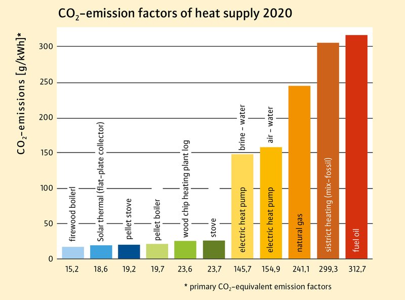 Figure 3 shows the climate impact of emissions from wood combustion in comparison with other heating systems: It is clear that the emissions per kilowatt hour of heat from all three types of wood firing are in the order of magnitude of solar energy, and significantly lower than those of oil or natural gas systems, and also than those of heat pumps. The emissions that occur upstream in the supply chain - i.e. during logging, transport and processing - are also included in the calculation for the wood combustion systems. As long as the quantity of carbon stored by the forest does not decrease, but maintains its level or continues to increase as before, the CO2-emissions from wood combustion do not burden the carbon emissions balance.