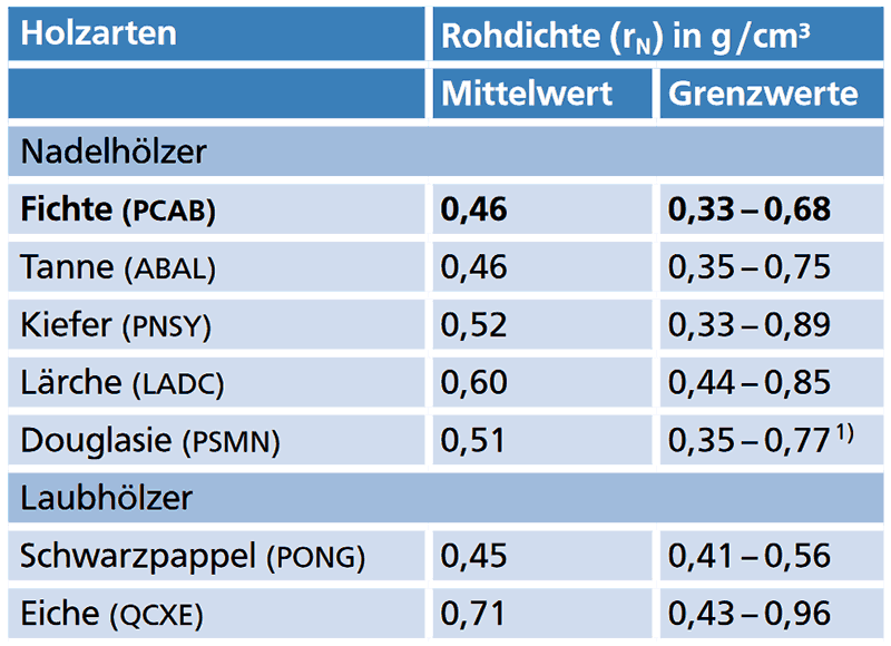 Spruce wood is classified as a mid-weight with a density of 0.46 g/cm3 at a wood moisture content between 12-15%. However, the weight is dependent on the width of the growth rings and has a wide range of variation (Table 1). As a result, it is only permitted to use conifer wood for construction purposes which possess growth rings between four and six millimeters in width (sorting class S13 and S10, respectively).