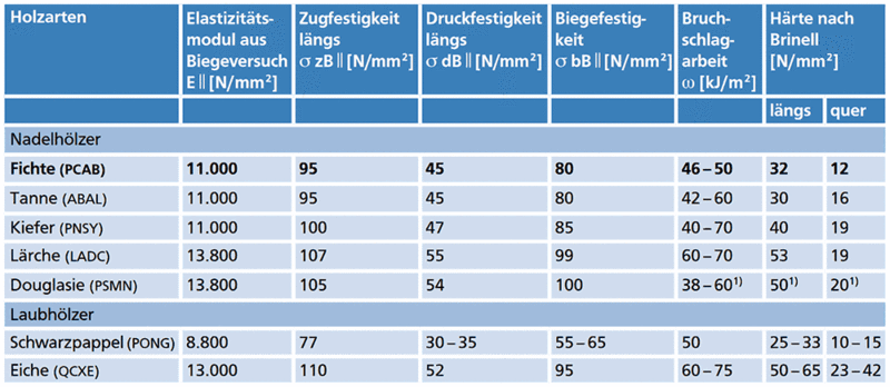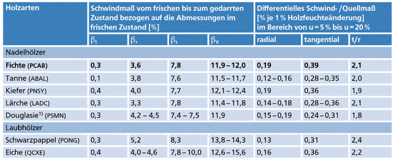 Due to the good characteristics in firmness and elasticity (Table 2), spruce wood lends itself exceptionally well for use as a construction timber. It does not swell much and after drying it features predominantly good dimensional stability (Table 3). Substantial deformations only occur from trees with pronounced spiraled growth or high amounts of compression wood.