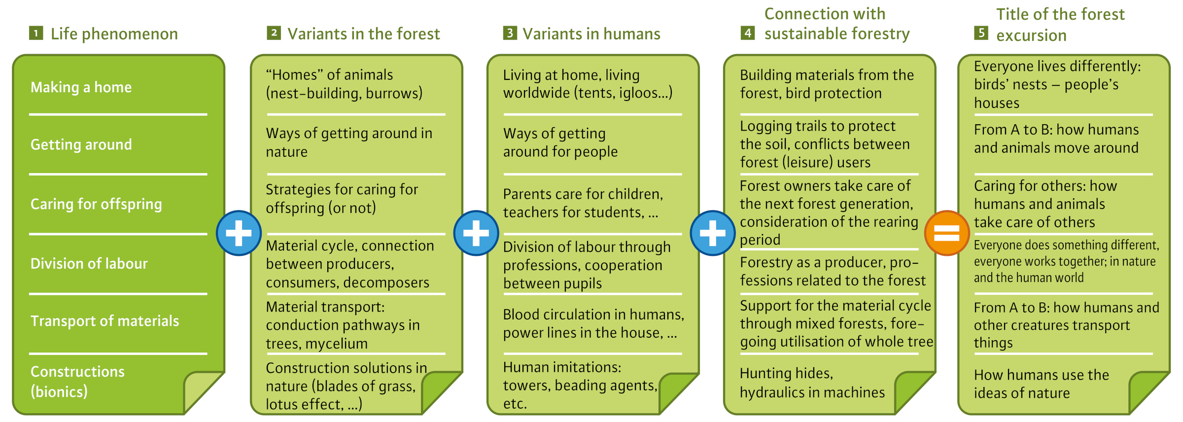 The “Forest Pedagogy Generator” in Figure 2 shows how forest education events on various topics can be developed, and how not only the forest habitat, but also the world of the participants and the achievements of sustainable forestry can thereby be elucidated.