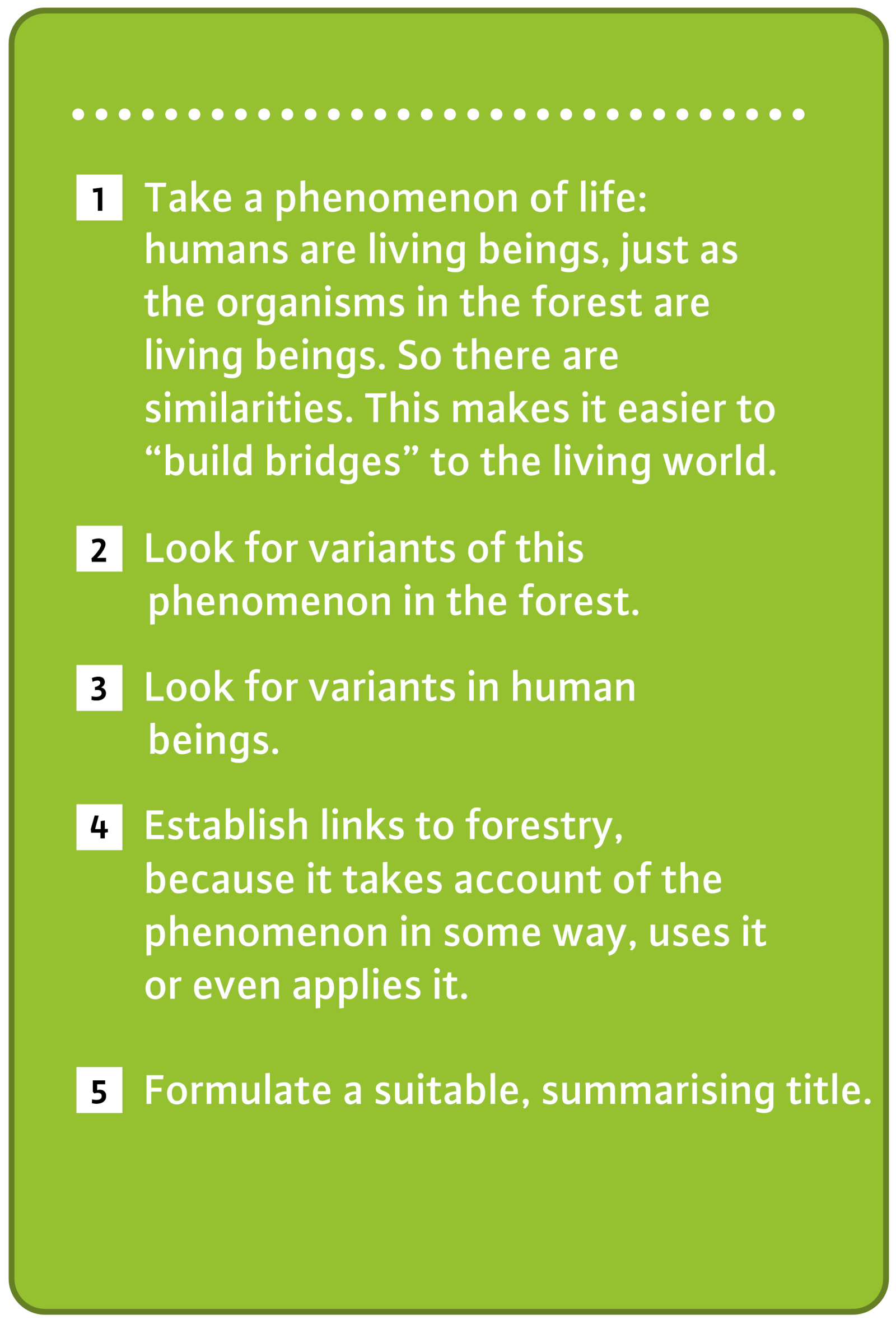 Good forest educators are trained and experienced in the art of communicating content in an easily understandable, clear and attractive way. Anyone who can make the connections in forests and forestry accessible to children and young people is certainly capable of doing the same for adults. The experience gained in setting up educational events in which a coherent concept - a common thread - is developed from activity to activity to form a compelling, meaningful whole that can be easily remembered and internalised, will also be useful for group advisory services or the forest educational programme.