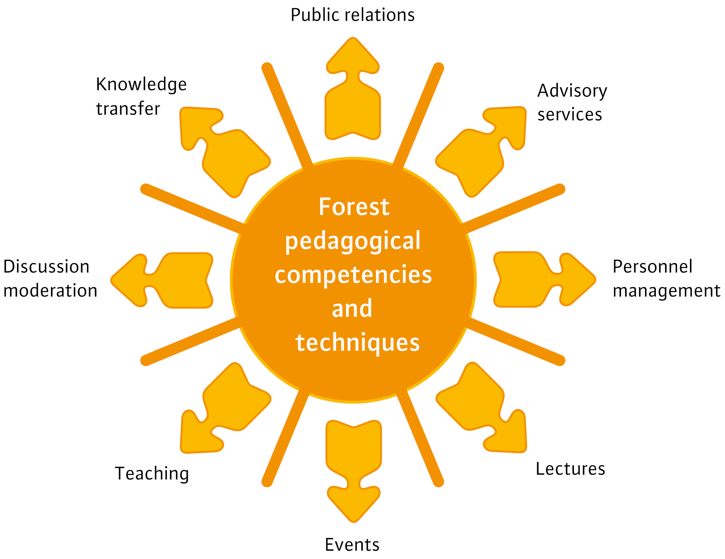 The pedagogical principles and communication techniques taught in a forest-pedagogical programme, e.g. at universities or on training courses on forest pedagogy within the forestry administration, can be applied in many other fields of work, including group advisory services, lectures, public relations work, personnel management and other areas. The other fields of work benefit from pedagogical and communication skills (see Figure 3).