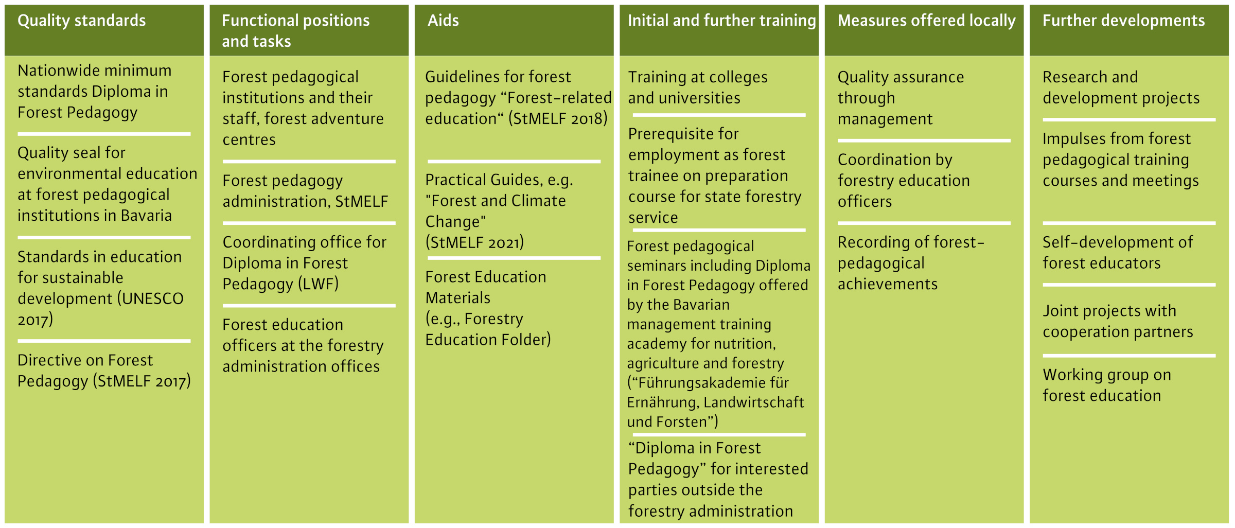 Forest pedagogy is taught at forestry colleges and universities and is among the topics that can feature in the state forestry examinations. The state forestry administration has its own internal training courses on forest pedagogy, including a course leading to qualification as a state-certified forest pedagogue. The 13 Bavarian forest pedagogical facilities (forest experience centres, the “Jugendwaldheim” forest educational centre for young people, and the Steigerwald Forest Centre) all have dedicated staff for forest education. There are coordinating offices at the Bavarian State Institute of Forestry and the State Ministry for Food, Agriculture and Forestry. Each Office for Food, Agriculture and Forestry has a forestry education officer who coordinates forest pedagogical programmes locally and is responsible for quality assurance in addition to management duties. Figure 4 gives an overview of the factors contributing to quality assurance and development in forest pedagogy.