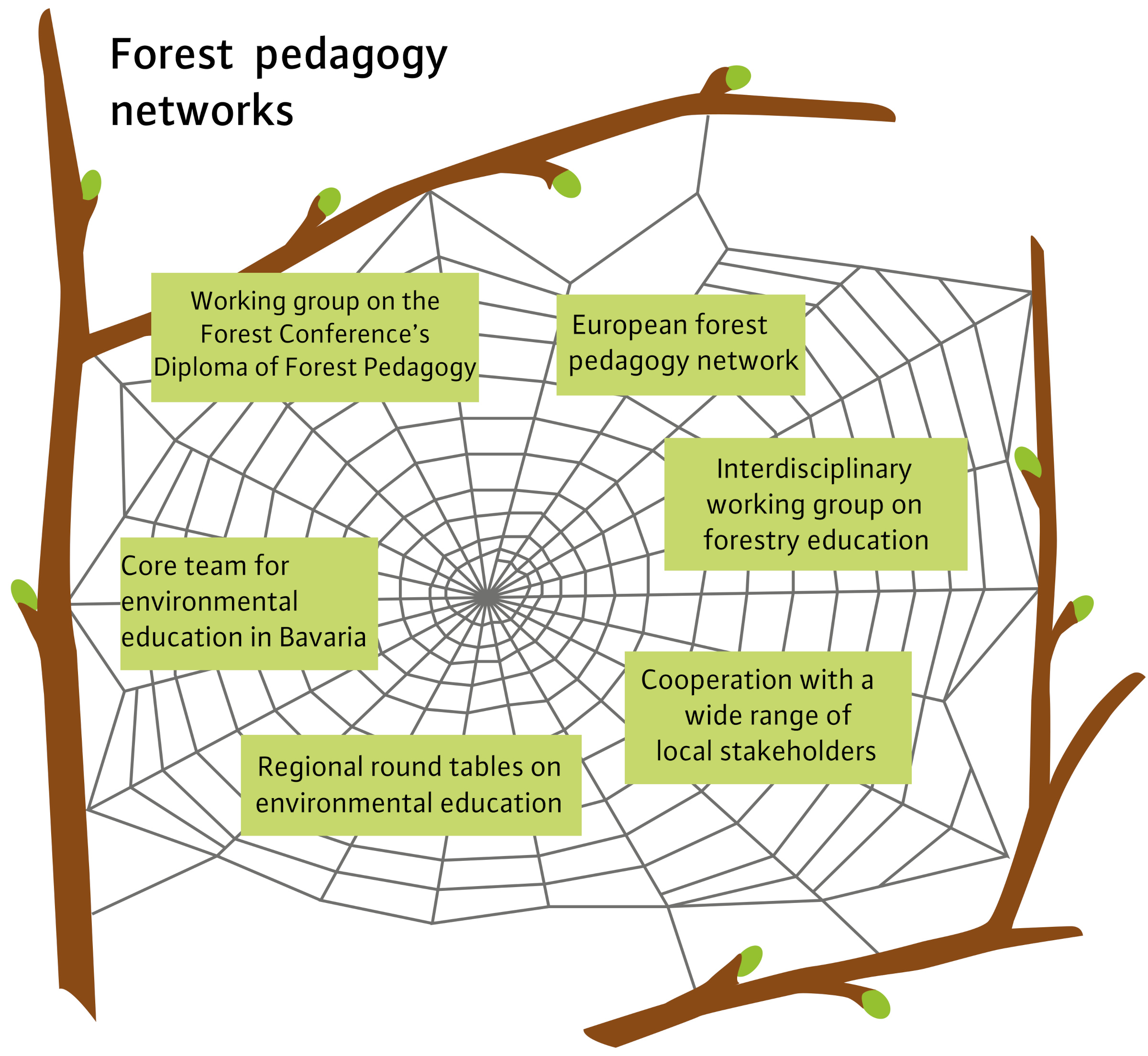 Another engine contributing to the ongoing development of forest pedagogy is the networking going on at different levels (see Figure 5). The Bavarian Forestry Administration is thus involved in the Forest Pedagogy Subgroup of the European Forest Communicators’ Network (Schmechel 2014), for example, which organises an annual international forest pedagogical congress.