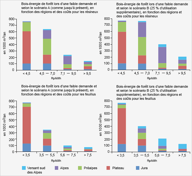 Pour la première question, il s’agit d’évaluer de manière différenciée la disponibilité économique à court terme des potentiels grâce à une prise en compte des coûts partiels. Pour ceci, les frais de mise à disposition sous forme de copeaux forestiers ont été déterminés (fig. 5). Les données s’appuient sur le cas d’une demande faible en bois, ainsi que sur les scénarios A (comme jusqu’ici) et B (25 % d’utilisation supplémentaire). Les frais de mise à disposition du bois sont un facteur clé pour la rentabilité de l’ensemble du système bois-énergie, et donc pour l’utilisation des potentiels en bois-énergie de forêt supplémentaires. Si on veut améliorer cette disponibilité, il faut diminuer les coûts de toute la chaîne de distribution.