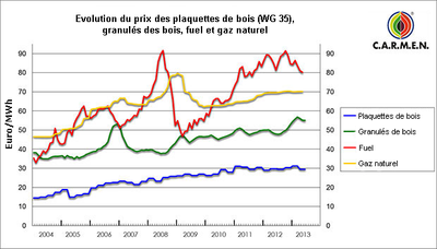 Figure 2 - Evolution du prix des plaquettes de bois de 2004 à 2013. Graphique: C.A.R.M.E.N. e.V.