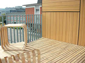 Fig. 6. Le bois en aménagement extérieur: cette façade résistante aux intempéries et aux UV présente un système de revêtement spécial à base de cellulose microfibrillée, matériau de renforcement et de support pour des substances actives. Les fissures sont moins nombreuses et la façade est protégée des micro-organismes. Les meubles du balcon sont constitués d’un nouveau matériau en composite de bambou. Photo: Doris Hölling (WSL)