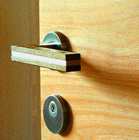 Fig. 3. Lorsque du carbonate de calcium est stocké dans le bois - par exemple une porte plaquée hêtre - son inflammabilité est réduite. Cette qualité est très importante en aménagement intérieur. De même, le stockage d’iode désinfectant dans le bois est une idée formidable: une poignée de porte fabriquée avec du bois ainsi traité devient bactéricide. Photo: Doris Hölling (WSL)