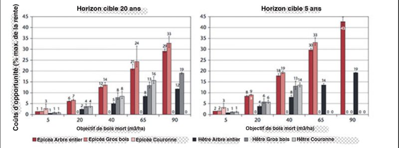 Fig. 3.Comparaison des stratégies de bois mort avec un horizon cible de 20 ans (à gauche) et de 5 ans (à droite). Coûts d’opportunité (pertes) par rapport à la rente maximale réalisable.