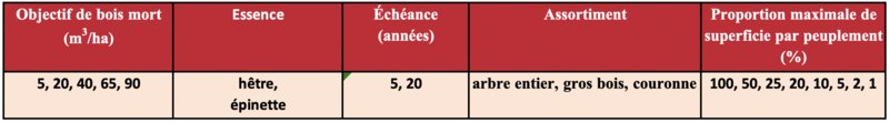 Tab. 1. Synthèse des paramètres des concepts de bois mort. La superficie maximale par peuplement correspond au degré de ségrégation.