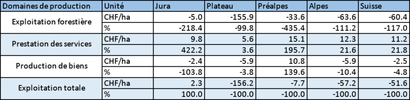 En 2019, les résultats d’exploitation sont négatifs pour la moyenne suisse (–52 CHF/ha). À l’exception du Jura, les résultats par zones forestières sont aussi négatifs (tab. 3).