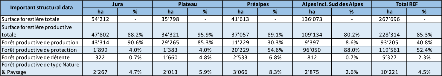 La superficie forestière totale de toutes les exploitations du REF est de 267 696 ha et correspond à 21 % de la surface forestière de la Suisse (OFS 2020). La part de la surface forestière productive est de 85 % (tab. 1). La fonction prioritaire de protection est la plus importante en termes de superficie, représentant largement 52 % de la surface forestière productive, suivie de la forêt de production avec 41 %. La forêt de loisirs (2 %) ainsi que la forêt de type nature et paysage (5 %) sont moins importantes en termes de superficie (tab. 1). Le centre de production Exploitation forestière est divisé en quatre fonctions prioritaires : forêt de production, forêt de protection, forêt de détente et forêt de type Nature et Paysage. La fonction prioritaire est déterminée sur la base du plan de gestion, du plan forestier régional (PFR) ou sur appréciation des chefs d’exploitation.