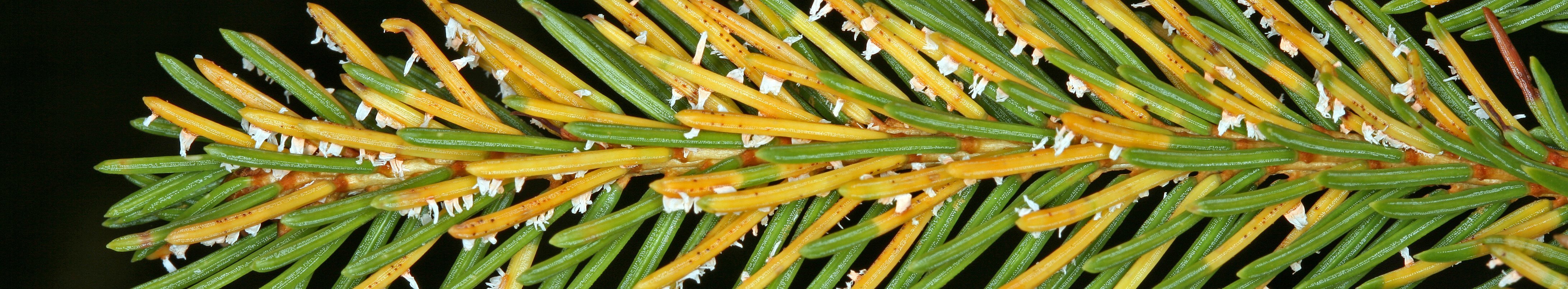 Fig. 1. La rouille vésiculeuse des aiguilles de l’épicéa (Chrysomyxa rhododendri) entraîne des symptômes visibles sur les aiguilles d’épicéa. Photo: Ulrich Wasem (WSL)