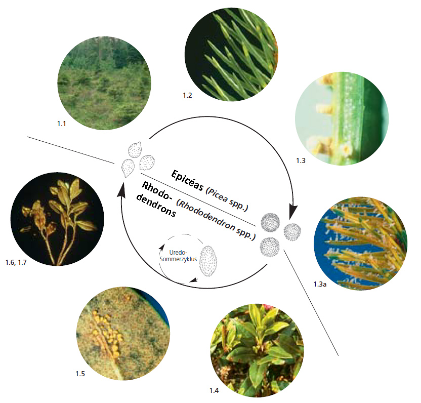 En Suisse, la rouille la plus fréquente est la rouille vésiculeuse des aiguilles de l’épicéa (Chrysomyxa rhododendri). Cette espèce alterne entre deux plantes-hôtes, le rhododendron et l’épicéa (fig. 3). Le champignon provoquant cette rouille se développe et perdure sur les deux espèces indigènes de rhododendrons. Il subsiste l’hiver sur l’une ou l’autre de ces deux plantes. Son hôte secondaire est l’épicéa, avec une préférence pour les jeunes arbres. La rouille vésiculeuse des aiguilles de l’épicéa n’a pas absolument besoin de l’épicéa pour se développer. Elle est de ce fait également présente à l’extérieur de l’aire d’extension de cette essence. Chrysomyxa rhododendri est très fréquent dans les Alpes et dans d’autres montagnes d’Europe. On le retrouve en Suisse entre 1000 et 2000 m d’altitude. Il est particulièrement répandu dans les vallées des Alpes grisonnes et tessinoises.