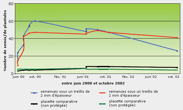Dans les deux cadres en bois, 60% et 47% des semences de chêne germèrent; sur les surfaces de contrôle voisines sans protection, il ne s’agissait que de 4 et 5% (voir figure 2).