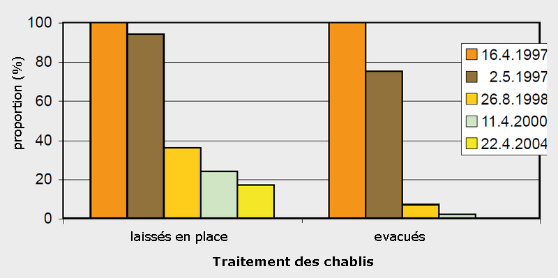 Après la tempête Viviane des 27 et 28 février 1990, l’Institut fédéral de recherches WSL a lancé un projet pour comparer les placettes déblayées et non déblayées. Une des questions abordées alors fut de savoir si le bois de tempête protège les semis naturels de la dent du gibier. Les premières observations ont laissé entrevoir que cette protection n’était pas homogène sur l’ensemble de la zone de chablis. Cette supposition a été confirmée par un travail de diplôme dans lequel non seulement les semis et les abroutissements, mais aussi les excréments ont été relevés. Cette étude a démontré que le gibier ne pouvait pas accéder à de grandes surfaces sur la zone de chablis non dégagée.