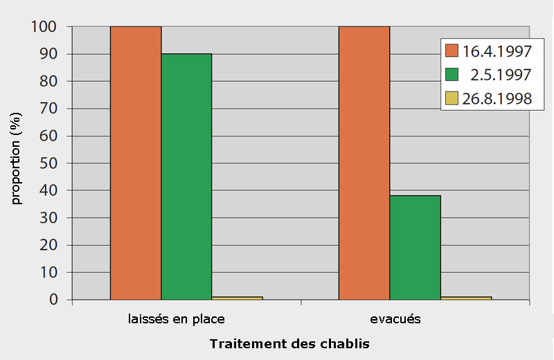 Après 16 jours, quatre plants étaient abroutis dans la zone non déblayée – tous dans les mêmes carrés de plantation. Les neuf autres carrés ne montraient aucune trace de gibier. Dans la zone déblayée, en revanche, 14 plants étaient abroutis, répartis sur cinq des huit carrés. Au bout d’un an, le gibier avait goûté à tous les plants, que ce soit sur la zone déblayée ou sur la zone non déblayée, pourtant fortement verrouillée par des enchevêtrements de troncs et de branches (fig. 4).