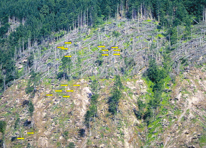 Fig. 1 - Le site d’étude, avec les carrés de plantation dans les zones déblayées et non déblayées (flèches jaunes).Photo: Ulrich Wasem (WSL)