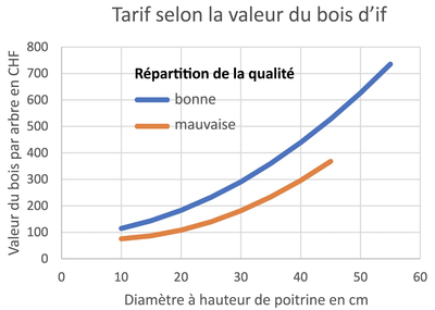 Lors des relevés de l’arbre sur pied, des estimations portant sur des assortiments de bois et sur leur longueur respective ont été faites. Les auteurs ont ensuite calculé les volumes à partir des troncs à terre. Grâce aux volumes et aux prix par assortiment, il a été possible de calculer la valeur de l’arbre sur pied. Le tarif selon la valeur du bois d’if a été défini d’après la répartition en qualité (tabl. 3) et représenté à la figure 3. Il existe une certaine dépendance de la valeur du bois à l’égard du DHP. Avec un DHP croissant, la valeur des arbres reconnus comme "bons" augmente davantage que celle des exemplaires évalués comme "mauvais".