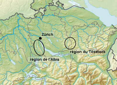 Fig. 1 - Zones mentionnées dans le texte. Fond de carte: Wikipédia, GNU Free Documentation License.