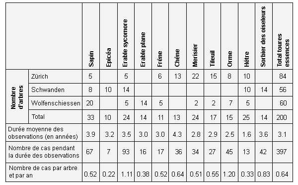 Tabl. 1 - Nombre d’arbres observés par essence, durée moyenne des observations et nombre de cas d’abroutissement relevés.