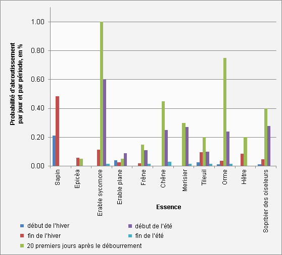 Dans notre étude, la probabilité d’être abrouti pour un jour donné varie fortement d’une espèce et d’une période à l’autre (fig. 6). Les données collectées indiquent par exemple que le risque d’abroutissement chez l’érable sycomore est de 1% pendant les 20 premiers jours après le débourrement, et d’environ 0% chez le sapin en été.
