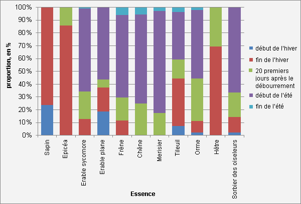 Chez le sapin, l’épicéa et le hêtre, l’abroutissement maximal a été constaté à la fin de l’hiver, chez toutes les autres essences pendant les 20 premiers jours suivant le débourrement et au début de l’été. Si l’on considère que les 20 premiers jours suivant le débourrement constituent une fenêtre de temps relativement courte, la proportion de cas observés est étonnamment élevée. Alors que la période 4 (début de l’été, environ 100 jours) dure cinq fois plus longtemps que la période 3 (20 premiers jours après le débourrement), elle a comporté un nombre de cas chez l’orme à peine 1,6 fois supérieure.
