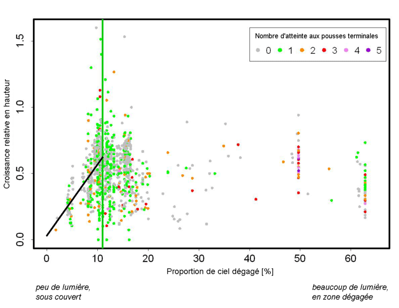 Fig. 4 - La «croissance relative en hauteur», c’est-à-dire la somme des accroissements de trois années successives divisée par la hauteur de l’arbre au bout des trois ans, sur les quatre sites. Jusqu’à 11% de lumière (ligne verticale verte), la croissance relative augmente de façon linéaire (droite noire). Cliquer pour agrandir.