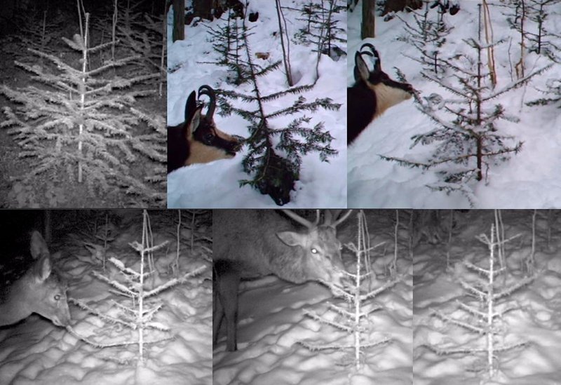 Fig. 1 - Photo prise par un appareil à déclenchement automatique dans un enclos de 5 m x 5 m planté de sapins âgés de 10 ans. La moitié de l’enclos a été ouverte au printemps 2009, mais ce n’est que l’hiver suivant, après la première neige, que des chamois ont commencé à abroutir les jeunes arbres. Photo: Andrea D. Kupferschmid (WSL)