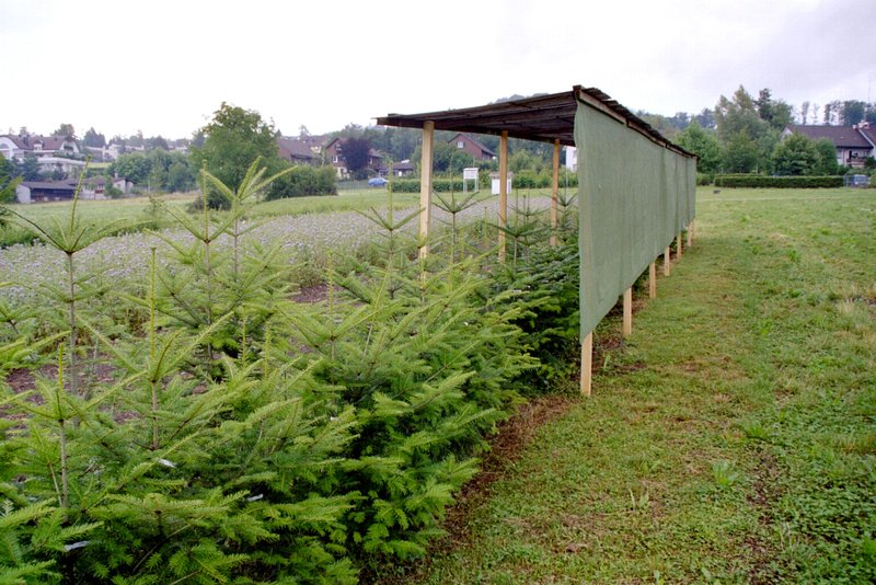 Dans le jardin du WSL à Birmensdorf (fig. 2), nous avons coupé la pousse terminale de sapins hauts de 75 à 110 cm juste avant le débourrement, juste après celui-ci ou en automne, en laissant seulement 4 cm de pousse, et nous avons comparé les réactions des sapins à ciel ouvert et sous ombrage artificiel.