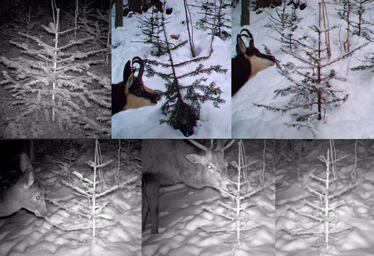 Fig. 7 - Photos automatiques d’un sapelot en automne 2009 avant l’abroutissement (en haut à gauche), pendant l’abroutissement par des chamois et des cerfs, et après, c’est à-dire fin janvier 2010 (en bas à droite). Si le gibier n’avait pas abrouti le même arbre de façon répétée, le degré d’abroutissement aurait été beaucoup moins prononcé. La pousse terminale n’est pas nécessairement consommée en dernier comme c’est le cas ici. voir film. Photos: Andrea D. Kupferschmid