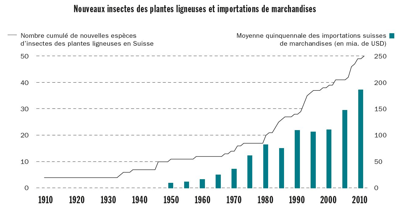 Figure 5 - Les espèces exogènes sont surtout importées lors du commerce mondial de marchandises et du trafic international de voyageurs. En Suisse, le nombre d’espèces étrangères d’insectes sur des plantes ligneuses a augmenté à partir des années 1930. Il est en nette corrélation avec le volume croissant des importations de marchandises selon les statistiques de l’OMC.