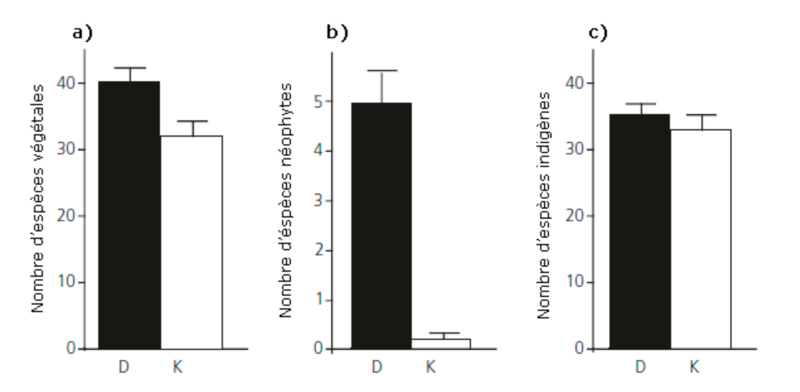 Fig. 5 - Nombre d’espèces végétales relevées aux points de dépôt de déchets verts (D) et sur les surfaces témoins (K) dans la région de Bâle: a) nombre total des espèces végétales, b) nombre d’espèces néophytes, c) nombre d’espèces indigènes. Le graphique présente la moyenne et l’écart-type des 20 endroits étudiés.