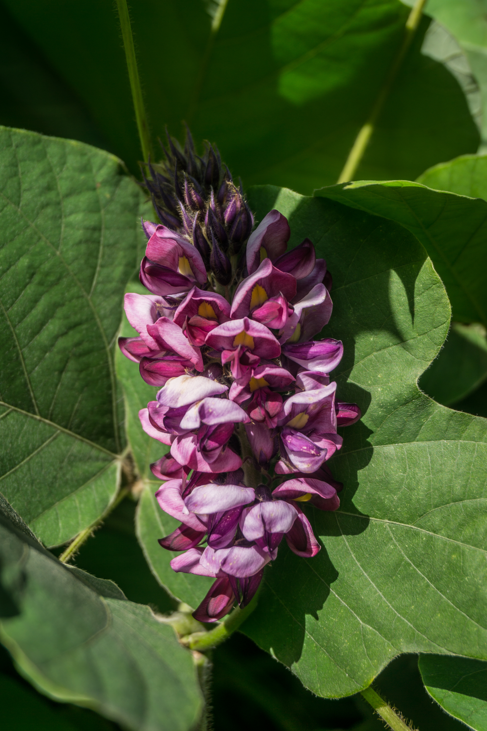 Le kudzu (Pueraria lobata) est une liane grimpante pluriannuelle aux feuilles trilobées de la famille des légumineuses (Fabaceae), originaire d’Asie du Sud-Est. Caractérisé par une croissance extrêmement rapide, il peut atteindre 26 cm par jour et 20 m par an ! Le kudzu forme un système interconnecté de lianes verticales et horizontales. Les nœuds des racines des lianes horizontales peuvent donner naissance à des tubercules souterrains qui constituent une réserve de nutriments et d’eau atteignant des volumes et des poids considérables, jusqu’à 180 kg. Les nœuds peuvent se séparer de la plante mère et développer de nouveaux individus autonomes (reproduction générative similaire à celle des fraises). Lorsqu’il pousse verticalement et qu’il est exposé directement au soleil, le kudzu produit des fleurs violettes en grappes, qui engendrent des gousses brun foncé contenant chacune 3 à 10 graines (les graines mûres se distinguent des immatures par leur couleur plus foncée). En raison de leur taux de germination élevé (environ 75 %) et de leur capacité à survivre plusieurs années, il est très probable que des banques de graines se forment dans le sol.