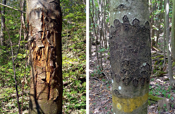 Fig. 1. A gauche, forme agressive du chancre du châtaignier (Cryphonectria parasitica) sur un jeune arbre. A droite, chancre guéri après un traitement réussi avec une souche de C. parasitica infectée par le virus. Photos: Phytopathologie WSL