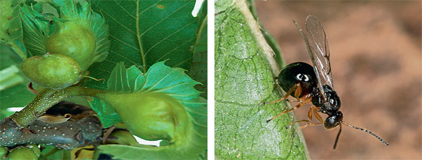 Fig. 2. A gauche, galles du cynips sur des feuilles de châtaignier. A droite, femelle de Dryocosmus kuriphilus, le cynips du châtaignier, lors de la ponte. Photos: Phytopathologie WSL, Beat Wermelinger (WSL)