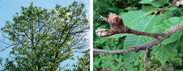 Fig. 3. A gauche, rameaux morts dans le houppier d'un châtaignier fortement atteint par Dryocosmus kuriphilus. A droite, rameau de châtaignier près de Sonogno (TI), porteur de galles et présentant des symptômes d’infection par Cryphonectria parasitica (lésions orange et fructifications). Photos: Phytopathologie WSL