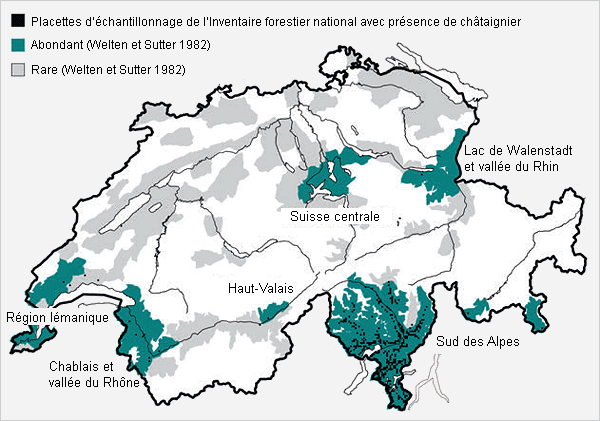 Fig. 4. Principales zones de répartition du châtaignier (Castanea sativa) en Suisse.