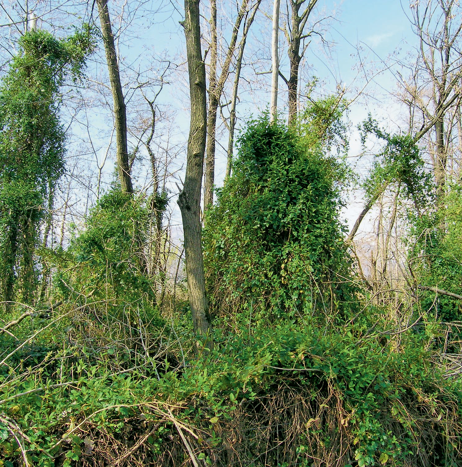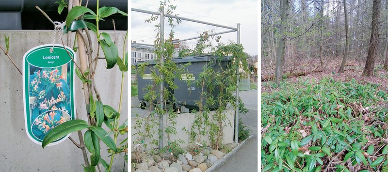 La figure 6 (voir ci-dessous) illustre l’une des voies de propagation d’une néophyte forestière envahissante. Le chèvrefeuille de Henry (Lonicera henryi) se vend dans le commerce. Il est souvent utilisé pour végétaliser des bâtiments et retourne à l’état sauvage dans les forêts avoisinantes. La liane se comporte de la même façon que le chèvrefeuille du Japon (Lonicera japonica). Néophyte envahissante, elle est répandue dans les zones à basse altitude du Tessin et pénètre localement dans les forêts de cette région, et ce jusqu’à la strate arborescente (figure 1).