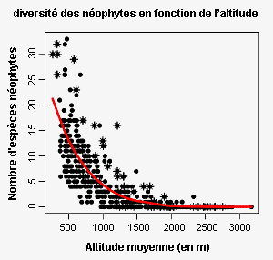 Fig. 2 - Répartition, en Suisse, de la diversité des néophytes en fonction de l’altitude (458 placettes du Monitoring de la biodiversité en Suisse, inventoriées de 2001 à 2006, de l’indicateur Z7 du MBD, correspondant à la "Diversité des espèces dans les paysages"). Les relevés au Tessin sont signalés par une étoile.