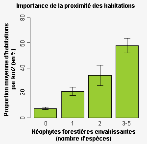 Fig. 5 - Corrélation entre la présence de néophytes forestières envahissantes et la proportion d’habitations (relevés MBD dans les zones à basse altitude; sans les relevés du Tessin plus riches en espèces; proportion moyenne d’habitations avec indication de la marge d’erreur).