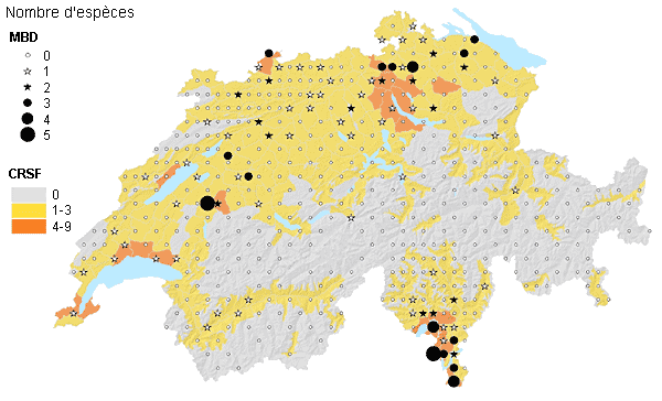 La figure 4 montre une carte de la présence connue, au niveau national, des néophytes envahissantes énumérées dans le tableau de la page précédente. Aux côtés des données de répartition du CRSF figurent celles correspondant aux relevés sur les placettes d’échantillonnage du MBD plus petites. La carte souligne que les néophytes forestières envahissantes se retrouvent dans les zones à basse altitude de toute la Suisse. Elles sont particulièrement fréquentes au Tessin, de même que sur les placettes d’échantillonnage du MBD plus petites.