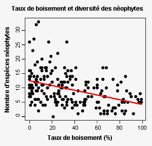 Fig. 3 - Relation entre la diversité des néophytes et la surface forestière sur 205 placettes MBD des zones à basse altitude (altitude moyenne inférieure à 1000 m; sans les relevés du Tessin plus riches en espèces).