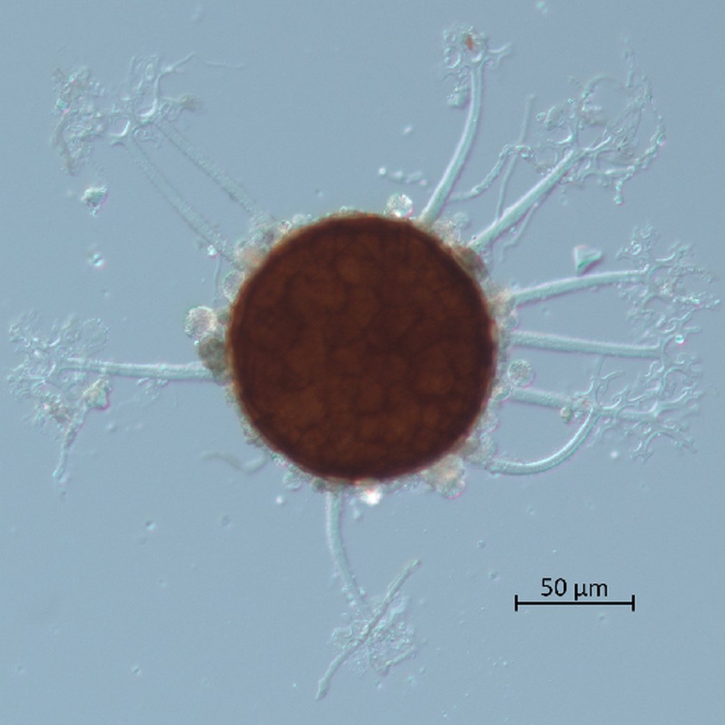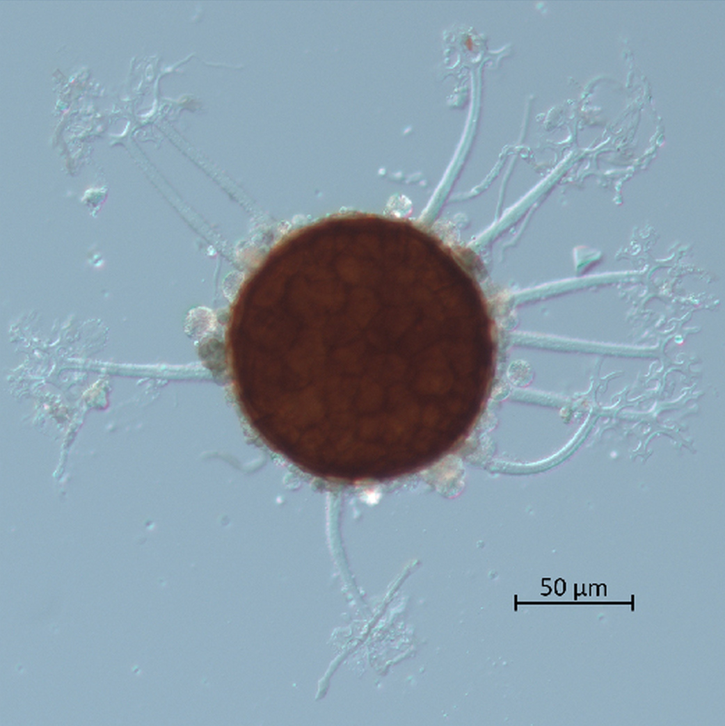 Fig. 2 - Détails d’une feuille infectée et d’une fructification sexuée. Photos: Ludwig Beenken (WSL)