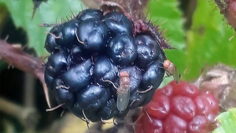 Fig. 1: Femelle ( à gauche) et mâle (à droite) de drosophile du cerisier (D. suzukii) sur une mûre de ronce. Photo: lrene Bühlmann
