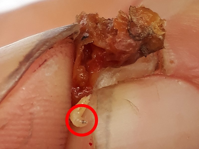 Fig. 2 : Pontes de la drosophile du cerisier Drosophila suzukii sur la ronce commune (Rubus fruticosus corylifolius agg., à gauche) et le sureau noir (Sambucus nigra, au centre). Les tubes respiratoires des œufs pendent généralement de manière bien visible hors du trou de ponte. À droite : crochet buccal noir et squelette céphalo-pharyngien de la larve sur une baie de chèvrefeuille des haies (Lonicera xylosteum). Photos: Irene Bühlmann