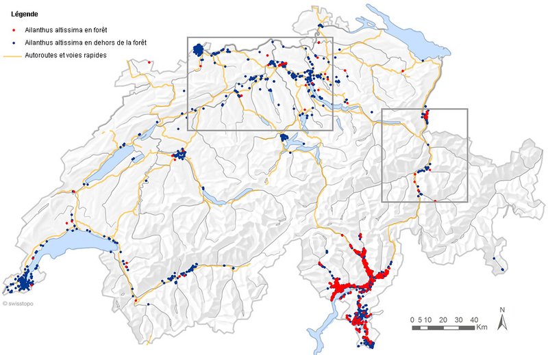 La plupart des occurrences d'ailante en Suisse se situent au sud des Alpes, où on les trouve à la fois en zone urbaine et en forêt. Ceci n'est pas une surprise. En revanche, le fait que plus de 90 cas aient été signalés en forêt au nord des Alpes est inattendu. Outre la principauté de Liechtenstein, les onze cantons touchés sont AG, BE, BL, GE, GR, JU, SG, VD, VS, ZG, ZH (fig. 3).