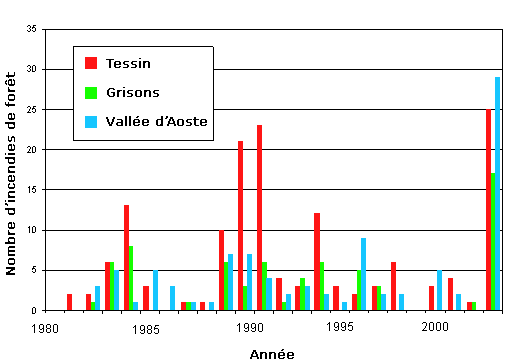 Figure 2 - Nombre annuel d’incendies de foudre répertoriés au Tessin, aux Grisons et en vallée d’Aoste (période 1980-2003)