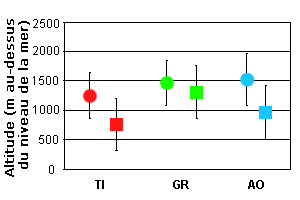 Figure 4 - Répartition des incendies de forêt répertoriés au semestre d’été (mai-octobre) en fonction de leur altitude, au Tessin, aux Grisons et en vallée d’Aoste (période 1980-2003). Cercles: incendies de foudre; carrés: incendies d’origine humaine, barres: écart type